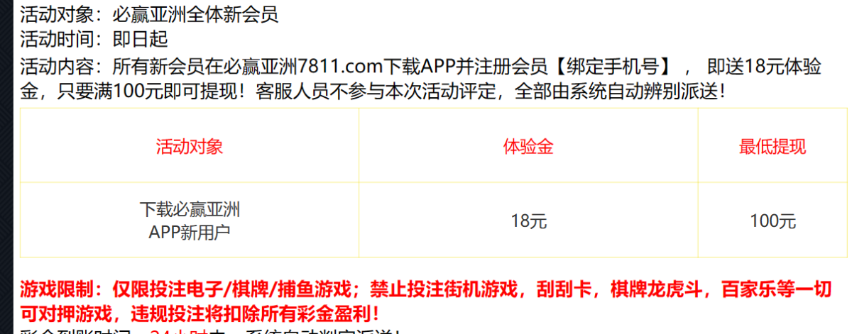 活动详情:新用户注册完善资料一小时内送18,不送就是多IP。限制电子/捕鱼,最低100提。,不要说这种不送,你不送不代表别人不送,这种十个人估计就送四个,完全看狗庄心情。还是那句话,撸不一定有,不撸一定没有。