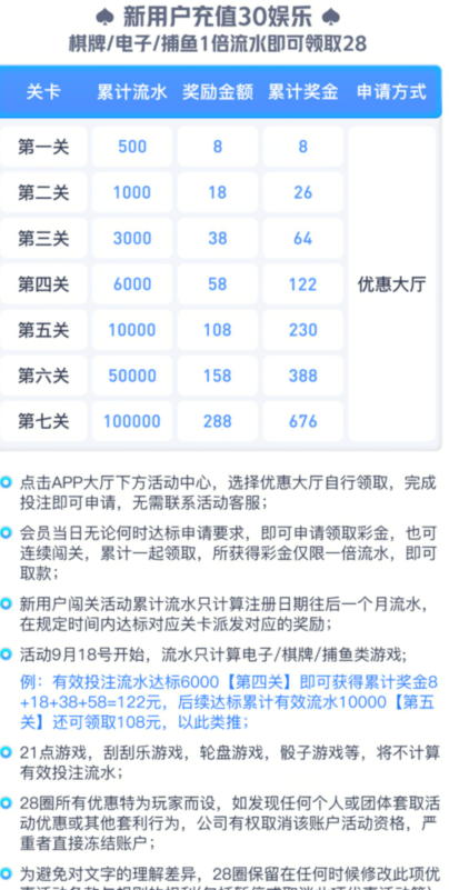 ※新用户电子棋牌捕鱼闯关 30+28 一倍水下注30流水后去优惠大厅申请闯关即可 (和上方的首存不冲突)