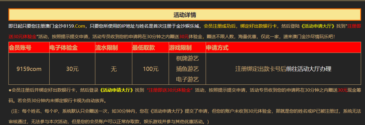 活动详情:新用户注册绑卡去申请页面自助申请30元彩金限制游玩电子捕鱼棋牌最低提款100元